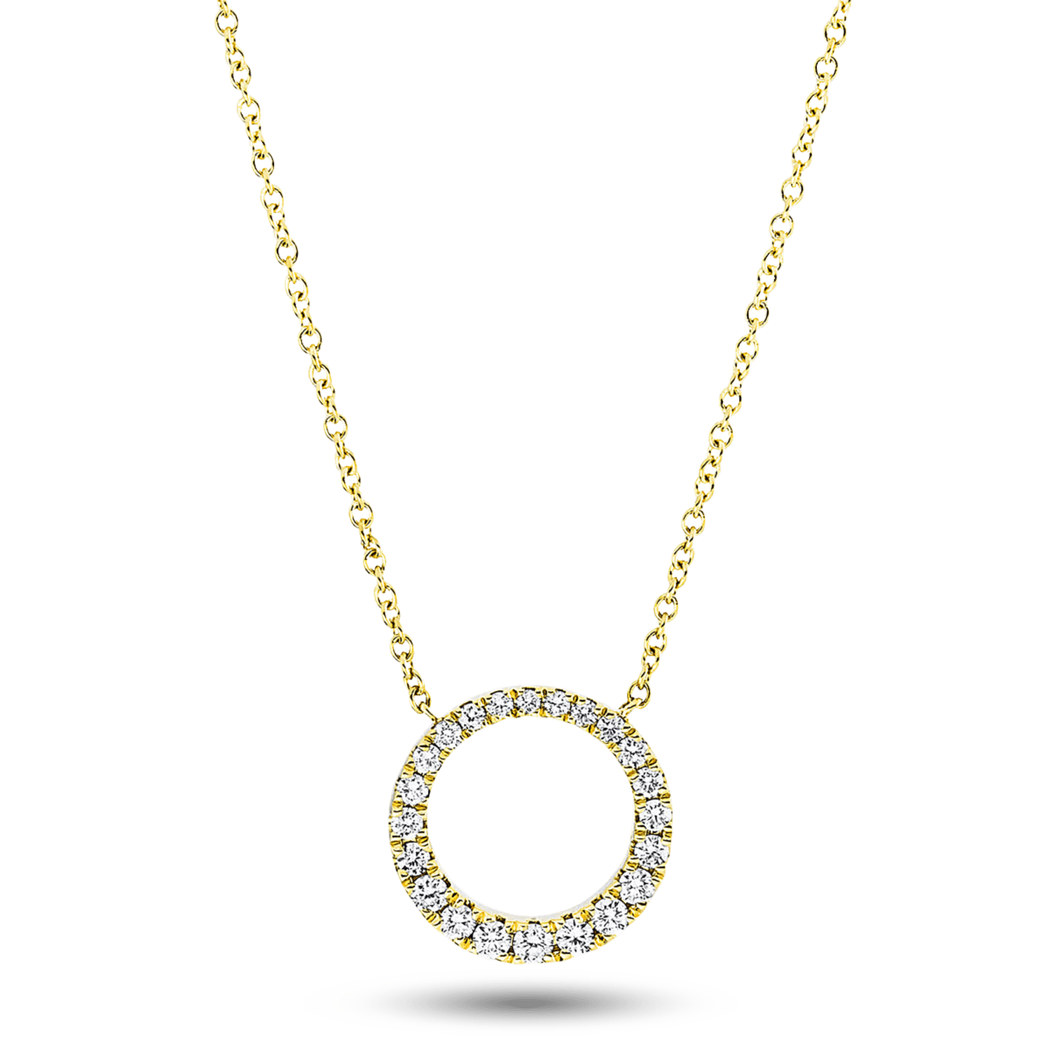 Hochwertiges Gelbgoldcollier in 750 Legierung mit einem Kreisanhänger besetzt mit zweiundzwanzig 0,30 ct. Brillanten in Top Wesselton und SI. Mit einer Zwischenöse bei 42 cm und einer Gesamtlänge von 45 cm.