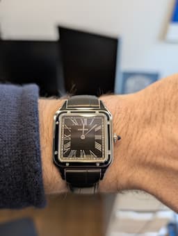 Für mich persönlich eine der schönsten Santos Dumont Referenzen. Das schwarze Blatt im Art-Deco Stil ist der Wahnsinn und absolut zeitlos. Die Größe ist klassisch und durch das 430 MC wunderbar flach. Durch das super Team bei Altherr konnte ich die Uhr schon nach kurzer Zeit mitnehmen.