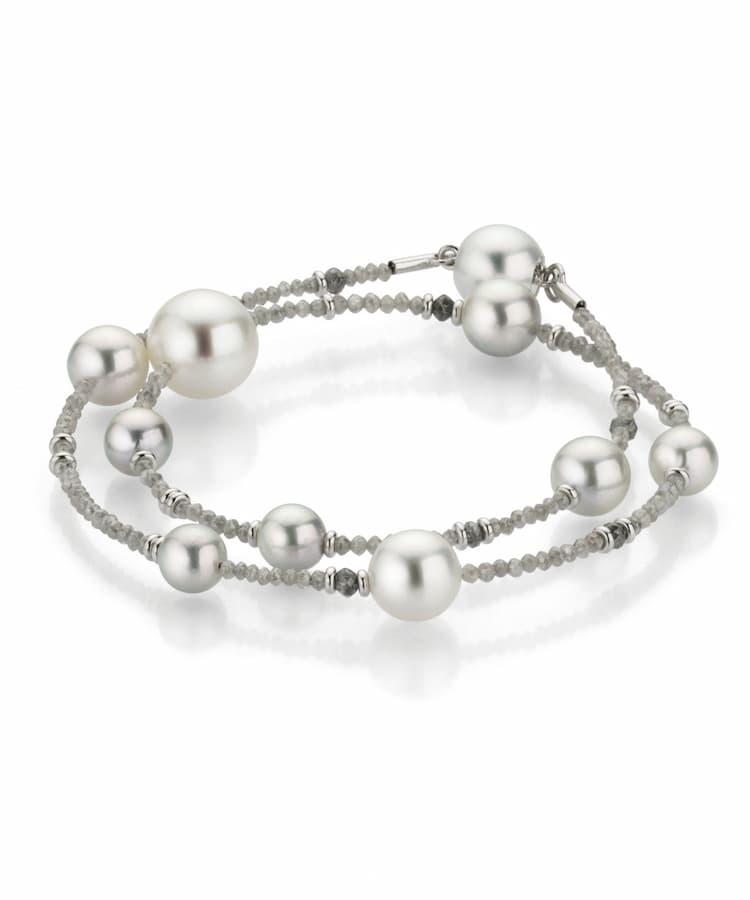 Gold 750 weiss, Dia. Bead ca. 6,707 ct. - 8,197 ct. anthrazit, 7 Akoya-ZP grau (natural) rund 7-8,5mm, 3 Südsee-ZP weiss rund 9-12mm, poliert, Armumfang ca. 16 cm / Länge ca. 37 cm, Magnetperlschließe.