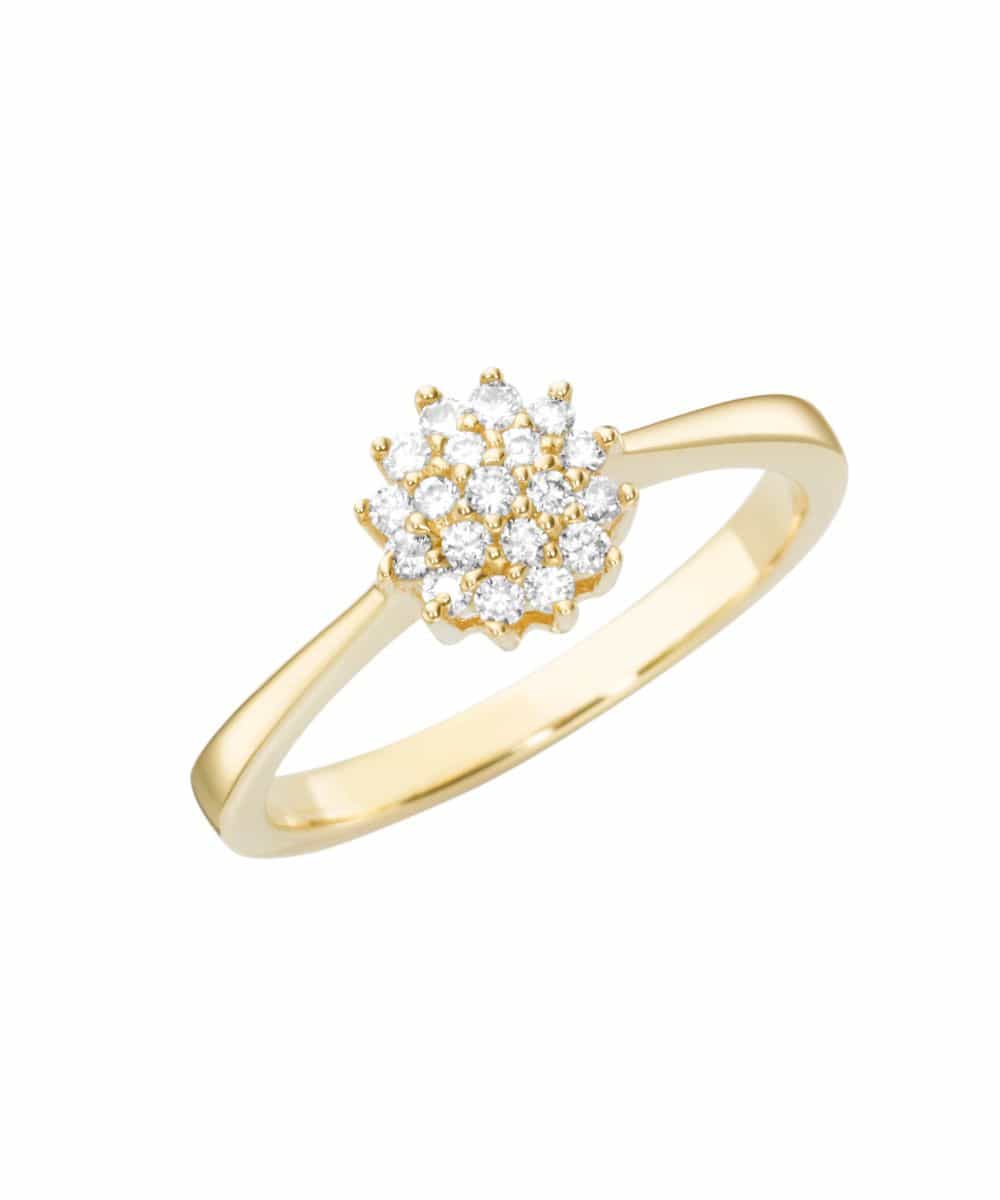Ring "Blüte" gegossen aus 14 Karat (585) Gelbgold. Besetzt mit 19 runden, weißen Diamanten im Brillantschliff mit insgesamt 0,25 ct. Krappenfassung am Ringkopf mit einem Durchmesser von 7,9 mm.