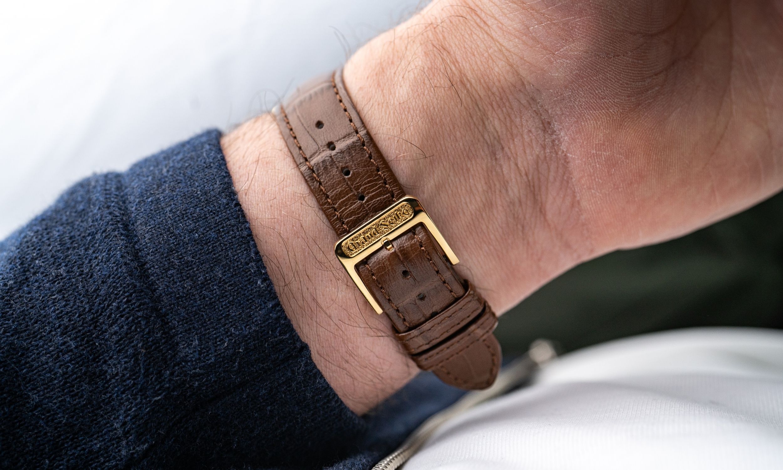 Besonders bemerkenswert ist, dass für dieses Modell das ikonische Gehäusedesign der 62GS von 1967 verwendet wird – zum ersten Mal in Gelbgold innerhalb einer nicht limitierten Auflage. Das Gehäuse zeichnet sich durch seine lünettenlose Konstruktion aus, bei der das Saphirglas direkt am Gehäuse befestigt ist. Dieses markante Design reduziert das optische Volumen und ermöglicht es dem Licht, aus verschiedenen Winkeln auf das Zifferblatt zu fallen, was die Textur der Oberfläche lebendig werden lässt. Trotz der historischen Wurzeln wurden Ergonomie und Bedienbarkeit der Krone modernisiert.