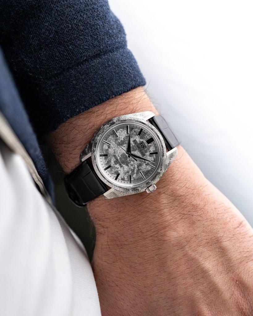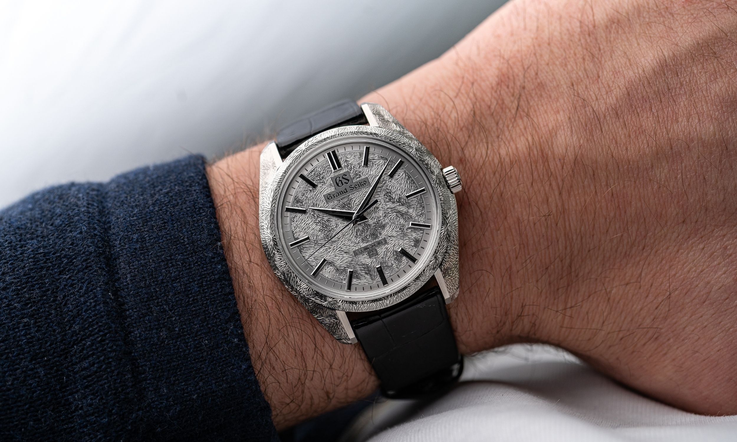 Das Zifferblatt ist ein Unikat: Von Hand gravierte Linien verlaufen in verschiedene Richtungen und kreuzen sich nahtlos, um das Bild von fließendem Wasser zu erzeugen. Zeiger und Indizes aus 14-karätigem Weißgold sorgen für eine brillante Lichtreflexion. Das legendäre 44GS-Gehäusedesign aus massivem Platin 950 wird hier durch eine aufwendige Gravur erweitert, die das Wasserfall-Motiv des Zifferblatts über die Kanten des Gehäuses hinweg fortführt. Die Kombination aus feinster Zaratsu-Politur und Gravur erzeugt ein faszinierendes Wechselspiel von Licht und Schatten.