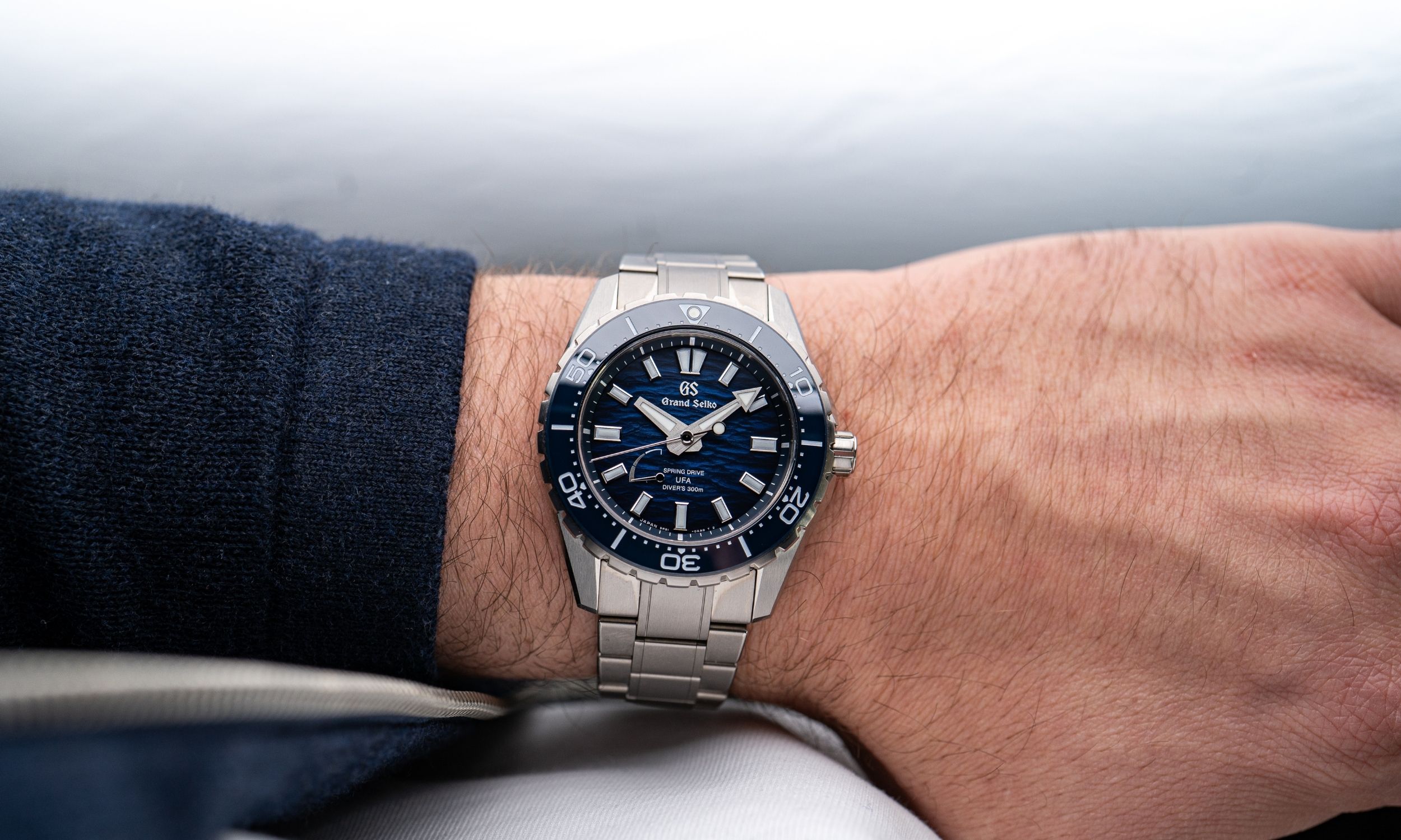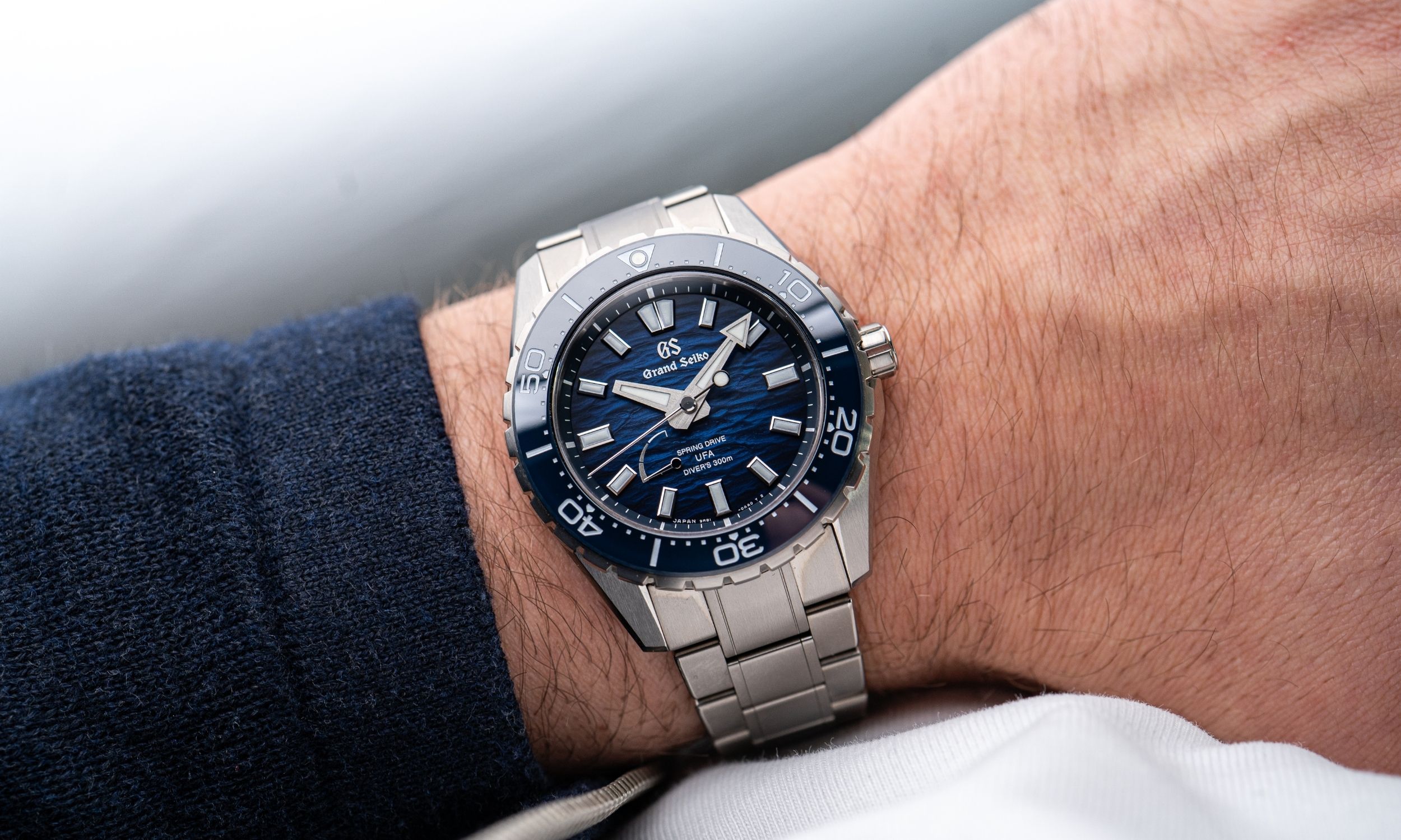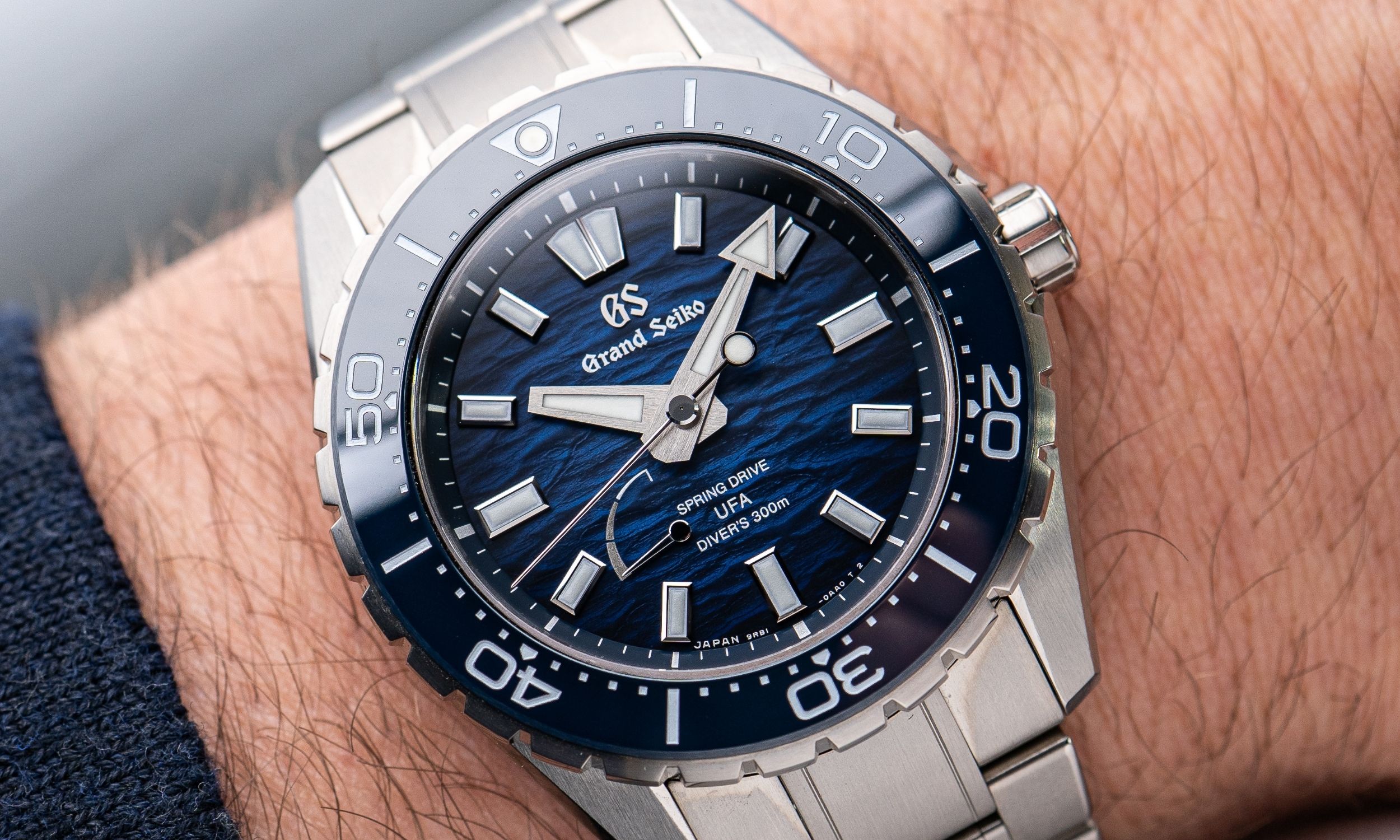 Neben dem farblichen Verlauf finden sich am Zifferblatt selbst auch Hinweise zum Kaliber bzw. zur Wasserdichtigkeit. So befinden sich im unteren Bereich des Zifferblatts die Schriftzüge „Spring Drive“, „UFA“ und „Divers 300M“. Links davon befindet sich die Gangreserveanzeige, welche mit der Einführung des neuen Kalibers vom Gehäuseboden zur Vorderseite des Zifferblatts gewandert ist.